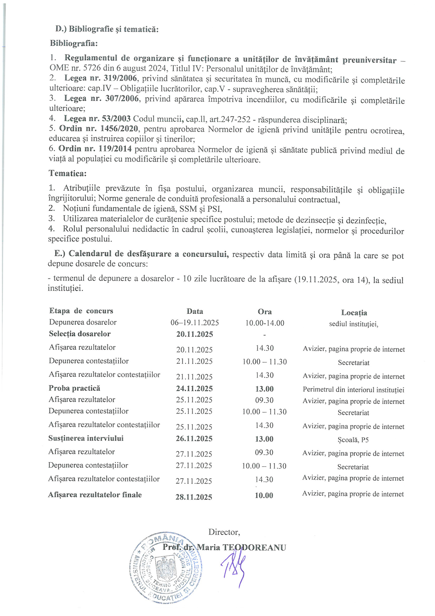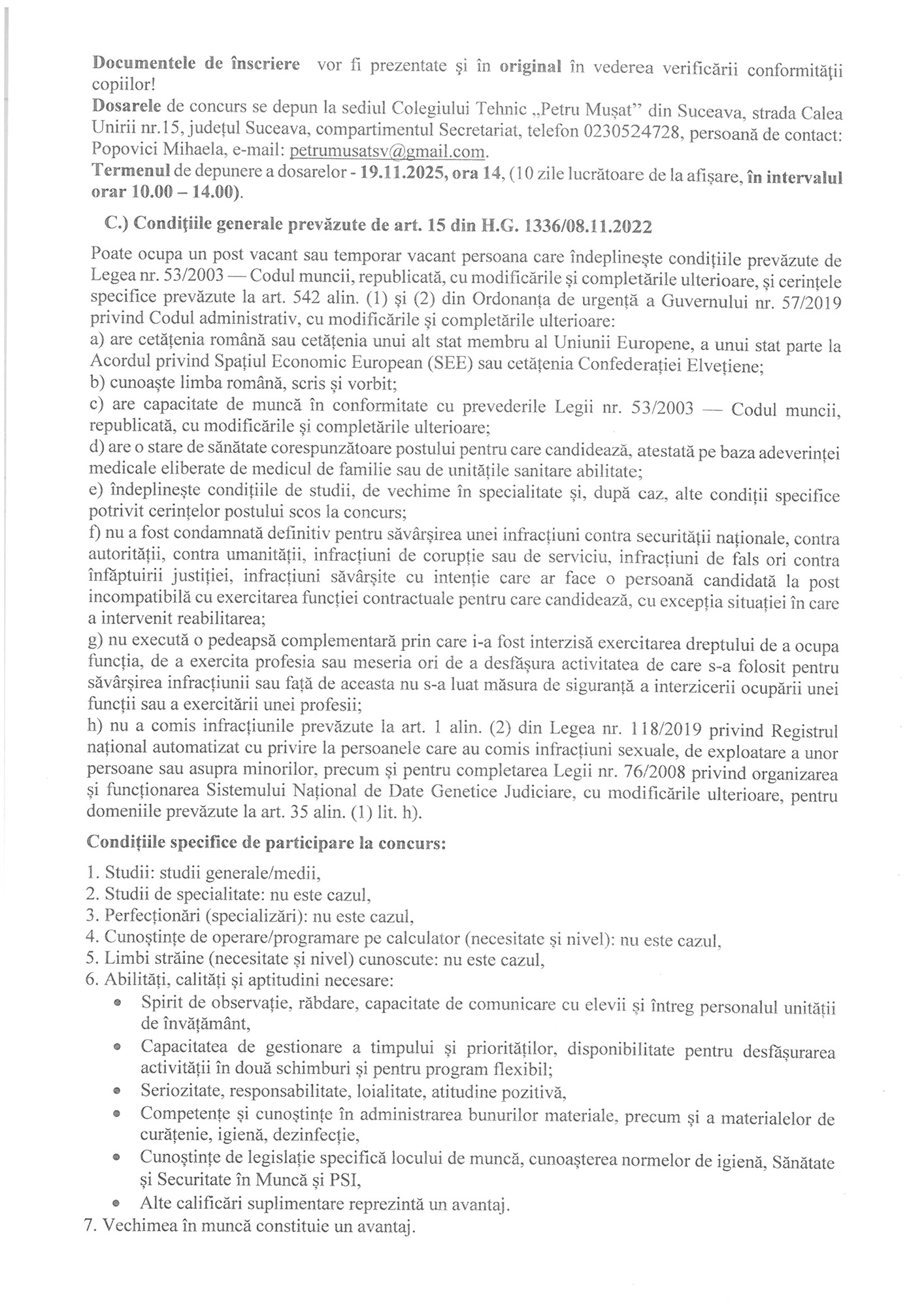 Angajăm un îngrijitor pe perioadă nedeterminată 11 noiembrie 2025 / Noutăți / Anunțuri Colegiul nostru anunță organizarea unui concurs pentru ocuparea unui post contractual vacant, în conformitate cu HG numărul 1336/2022.