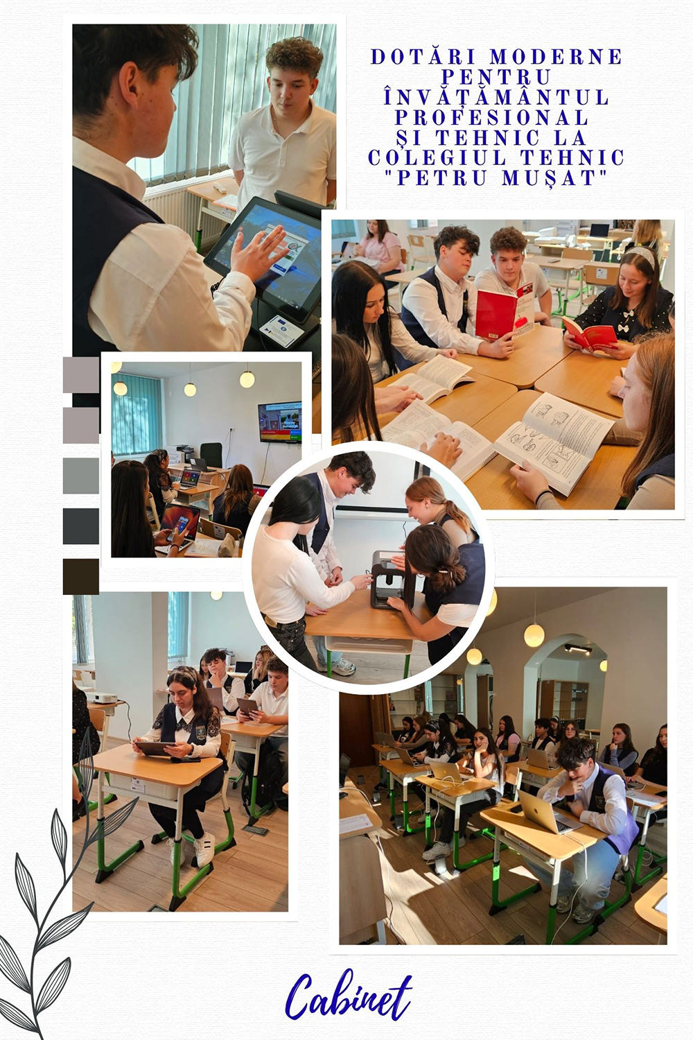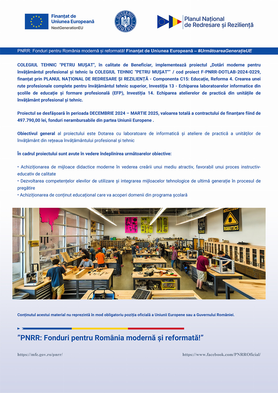 În calitate de Beneficiar, implementăm proiectul „Dotări moderne pentru învățământul profesional și tehnic la COLEGIUL TEHNIC „PETRU MUȘAT”” / cod proiect F-PNRR-DOTLAB-2024-0229, finanțat prin PLANUL NAȚIONAL DE REDRESARE ȘI REZILIENȚĂ – Componenta C15: Educație, Reforma 4. Crearea unei rute profesionale complete pentru învățământul tehnic superior, Investiția 13 – Echiparea laboratoarelor informatice din școlile de educație și formare profesională (EFP), Investiția 14. Echiparea atelierelor de practică din unitățile de învățământ profesional și tehnic.