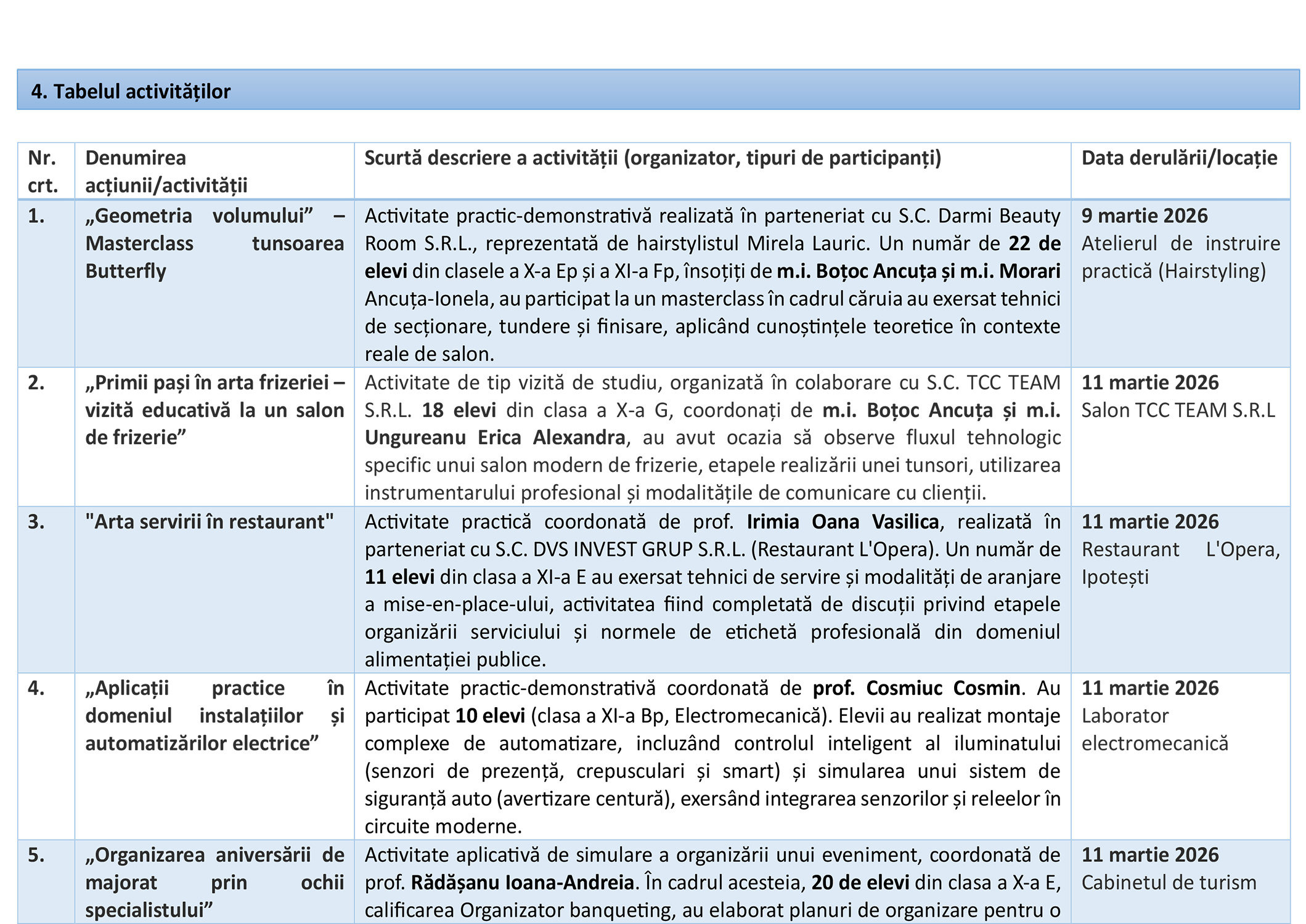 Parteneriatul cu Restaurantul L’Opera din Ipotești le-a oferit elevilor șansa de a exersa tehnici de servire și etichetă profesională la standarde de restaurant. Totodată, viitorii organizatori de evenimente au simulat planificarea unor aniversări de majorat, în timp ce elevii din anii terminali de la profilul Operator CNC au beneficiat de consiliere pentru integrarea pe piața muncii și redactarea CV-ului.