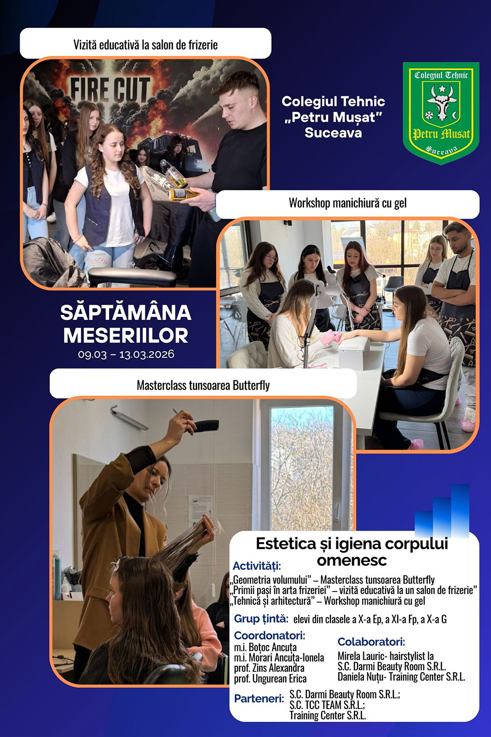 Elevii de la profilul de Hairstyling și Estetică au beneficiat de demonstrații practice realizate de profesioniști din domeniu. Printre momentele cheie s-au numărat masterclass-ul de tunsoare „Butterfly”, realizat în parteneriat cu SC Darmi Beauty Room SRL, și workshop-ul de manichiură cu gel susținut de Daniela Nuțu Training Center SRL. De asemenea, viitorii frizeri au observat fluxul tehnologic al unui salon modern în cadrul unei vizite la SC TCC TEAM SRL.