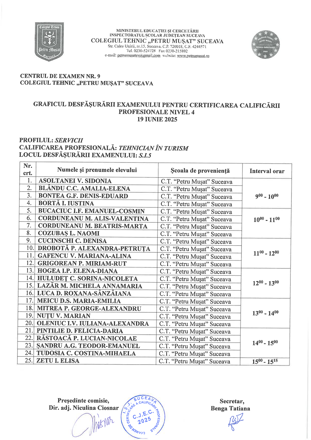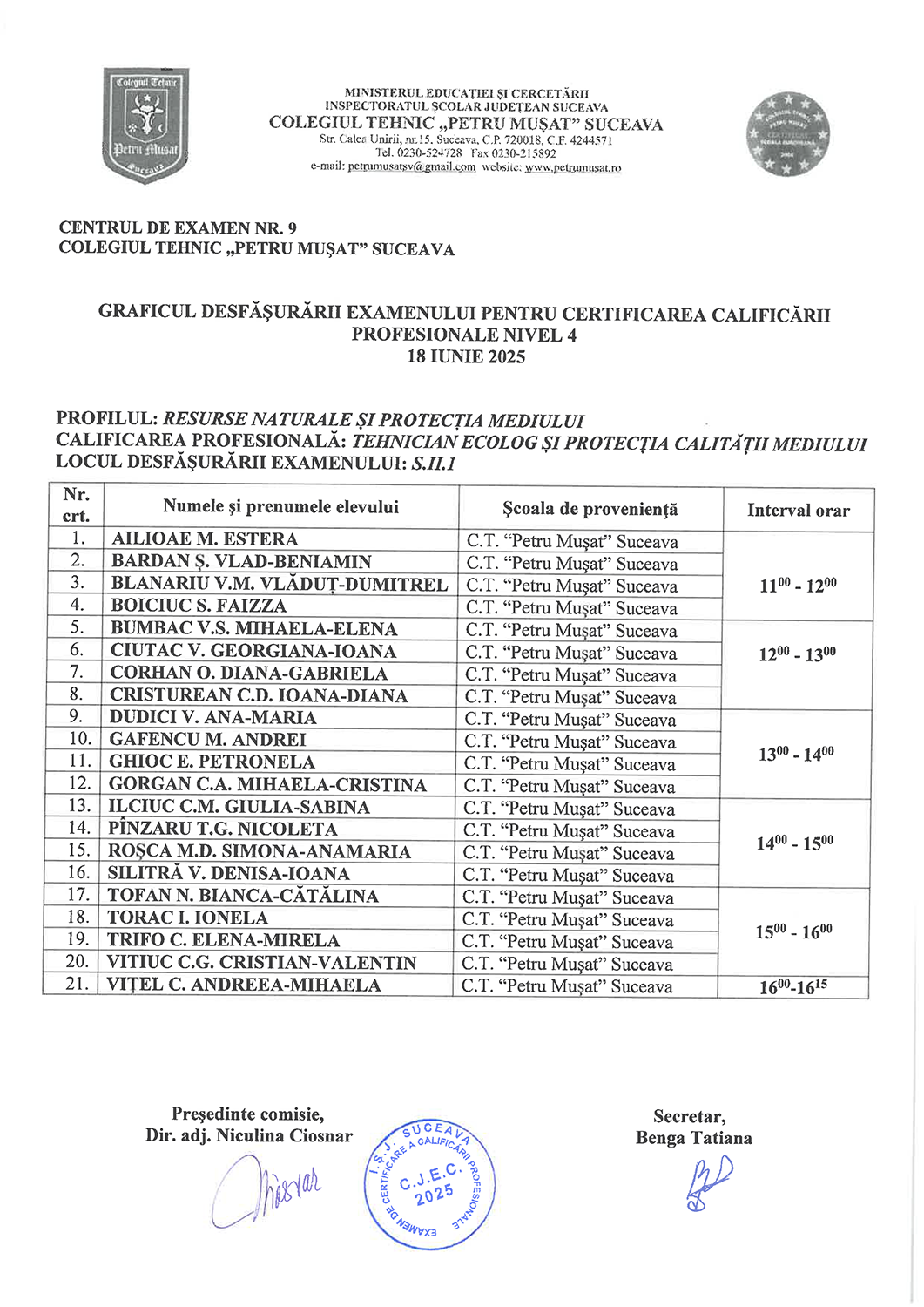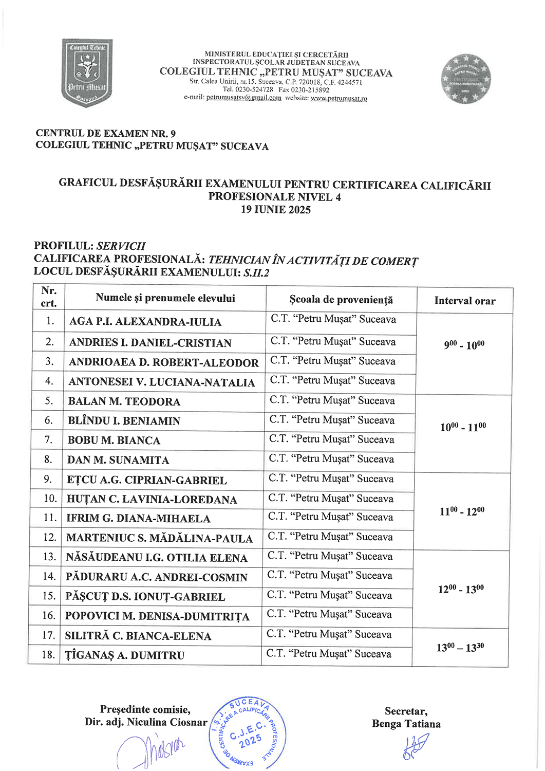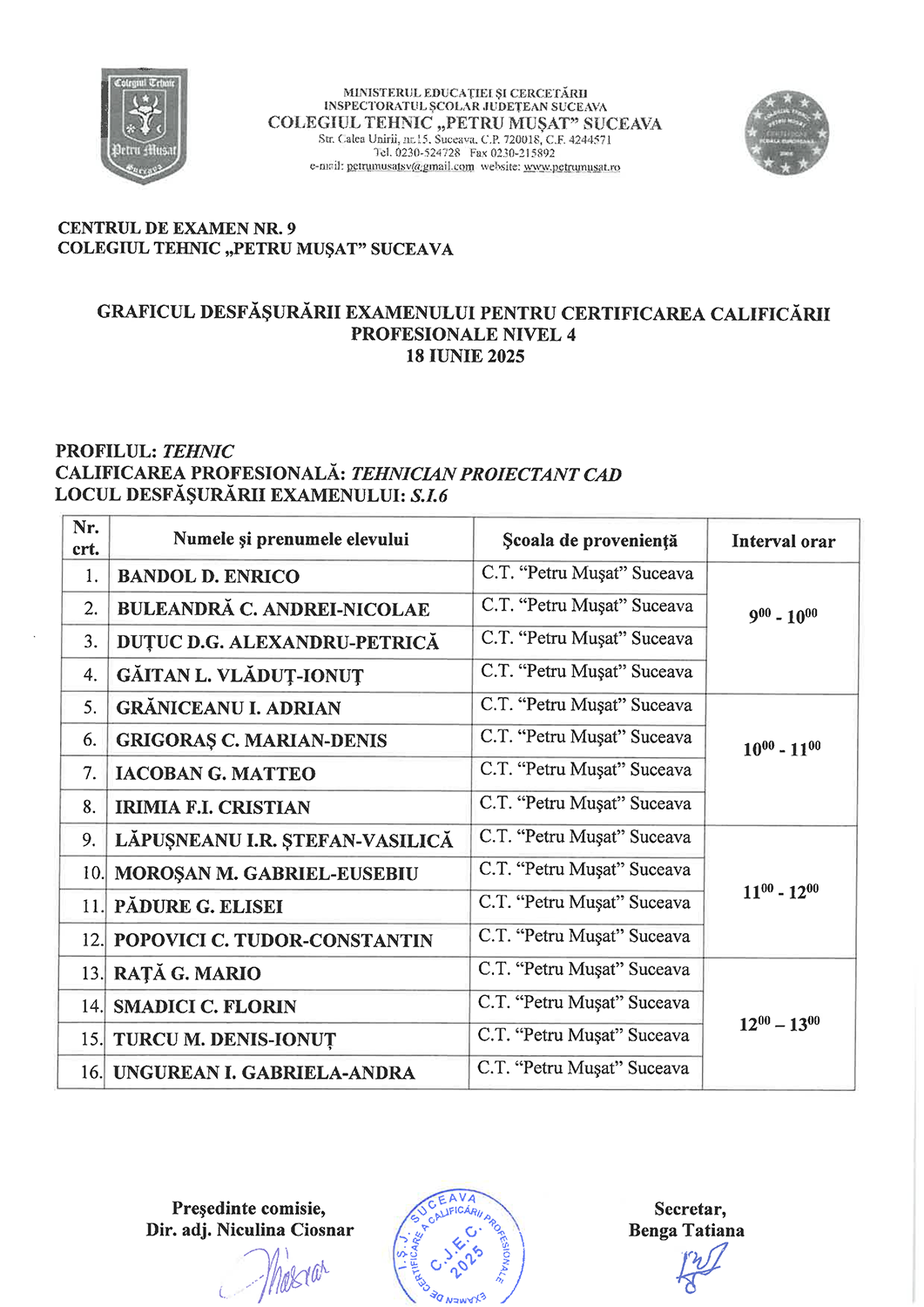 Graficul desfășurării examenului pentru certificarea calificării profesionale – nivel 4 (18 Iunie 2025) 17 iunie 2025 / Noutăți / examene Graficul desfășurării examenului pentru certificarea calificării profesionale – nivel 4 (18 Iunie 2025).